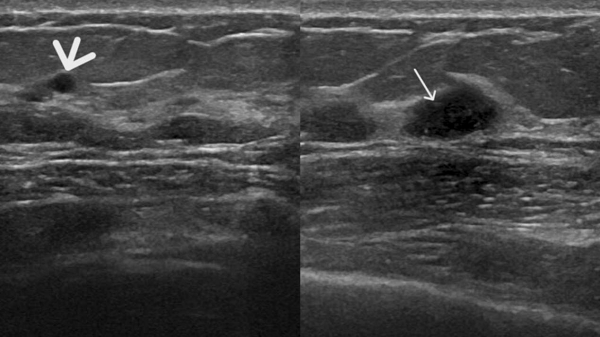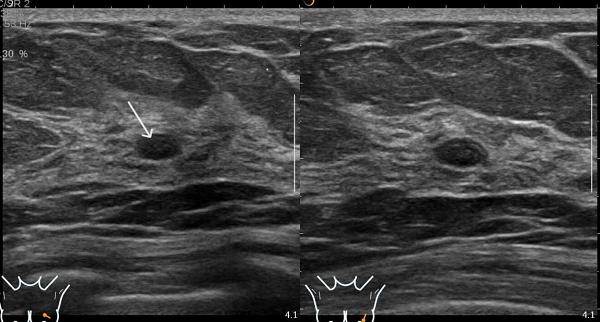 图4 患者B的超声图像,显示未见钼靶所示钙化灶,但扫查到乳腺实性低回声结节(图中箭头处)